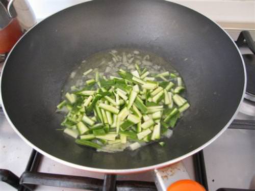 Tritare lo scalogno e rosolarlo in padella con l'olio. Unire le zucchine allo scalogno, aggiungere un mestolino d'acqua e lasciar cuocere una decina di minuti.
